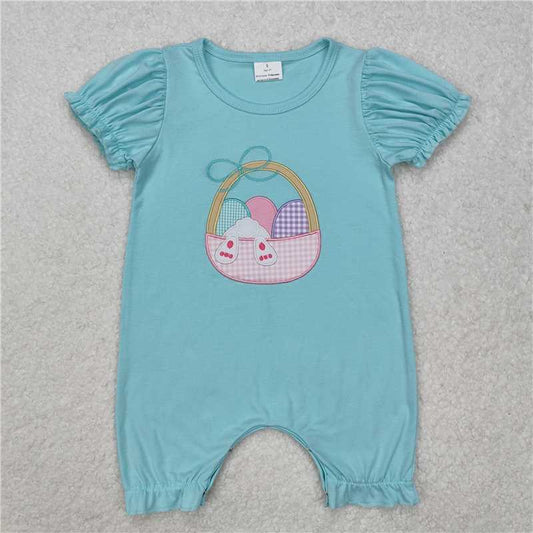 3.5 SR2292 Embroidered Girls Easter Bunny Egg Basket Teal Short Sleeve Bodysuit