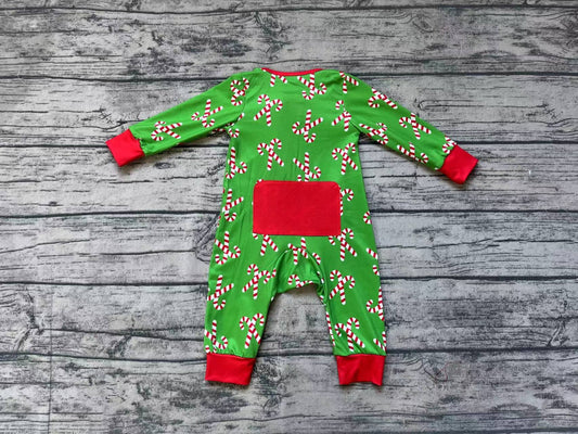 LR1237 Santa Claus Cane Red Trim Green Zip Long Sleeve Jumpsuit