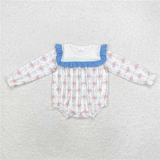LR1412 White long-sleeved jumpsuit with blue lace and flower bow pattern