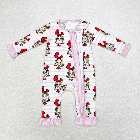 LR1001 grinch modal girls pink striped lace zipper long sleeve jumpsuit