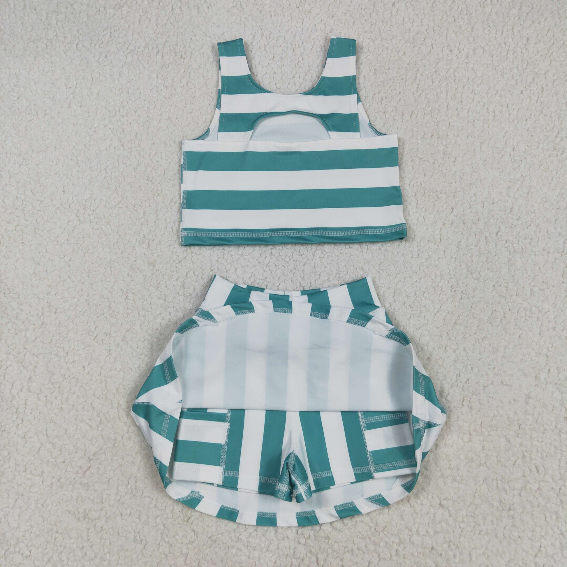 5.10 GSD2432 Green and white striped sleeveless vest and skirt yoga set
